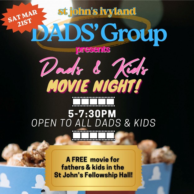 The St John’s Ivyland Dads Group is a community of fathers that support one another as we walk along life’s path. We offer opportunities for just dads, dads & kids, and some for families too. This movie night is for dads & kids. All fathers are welcome to join us anytime.