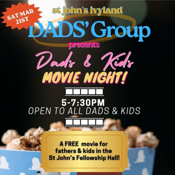 The St John’s Dads’ Group presents “Dads & Kids” Movie Night, Saturday, March 21st at 5pm!