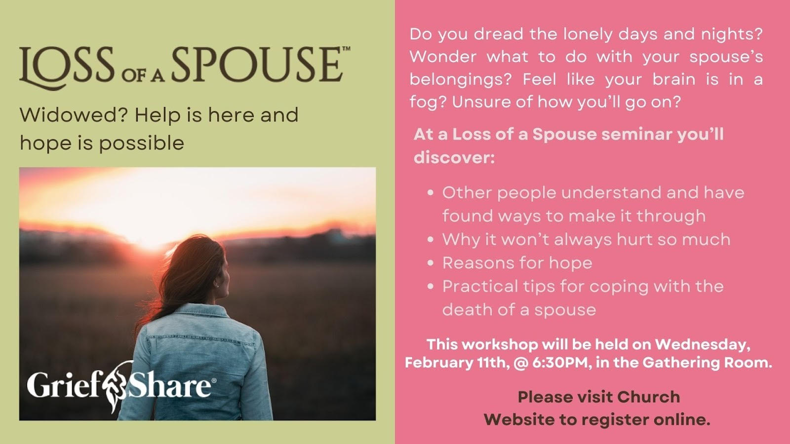 Loss of a Spouse workshop ( Wed 2/11 @ 6:30 pm)