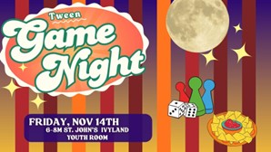 Sign up today for a FREE Fall Game Night for Tweens at St. John's Ivyland Friday Nov 14th from 6–8pm! Open to all 4th–7th graders. Register your kids for a night of fun games and food or sign up to volunteer.