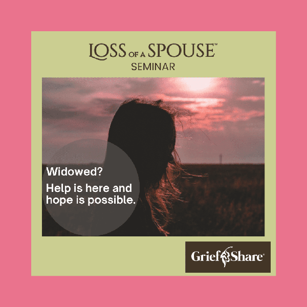 Losing a spouse can be difficult but you do not have to feel like it is impossible. GriefShare offers opportunities for those who have experienced loss to begin to connect with others who are going through something similar. The Loss of a Spouse seminar, is a one meeting program where we can connect to other people who have made it through, discover reasons for hope and be given practical tips for coping.